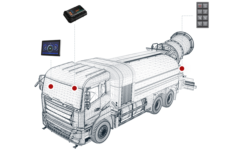 抑塵車電控系統(tǒng)采用新一代UI界面顯示,集顯控于一體,支持系統(tǒng)診斷與數(shù)據(jù)監(jiān)控功能,可實(shí)現(xiàn)遠(yuǎn)程升級,大大增強(qiáng)了工作效率和用戶交互體驗(yàn)。